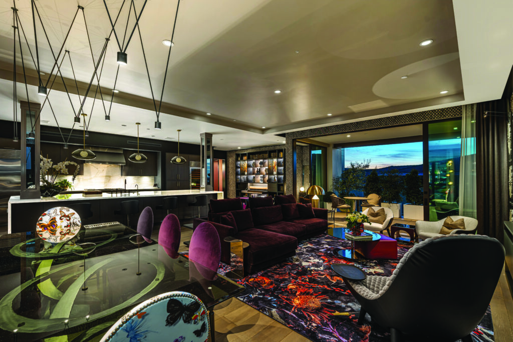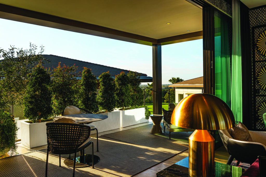 The heart of the home is a world-class culinary suite. Imagine hosting friends around a massive Calacatta Borghini marble waterfall island. This kitchen is a chef’s dream, featuring European-style soft-touch cabinetry, Louis Poulson pendants, and professional Wolf and Sub-Zero appliances. Furthermore, massive Fleetwood sliding glass doors dissolve the boundaries between the great room and an expansive grand terrace. It is the ultimate setting for al fresco entertaining under the California stars.